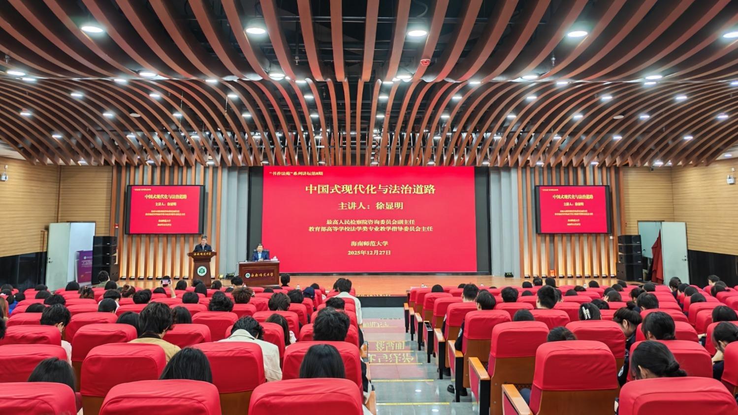 12月27日下午,法学院“书香法苑”系列讲坛第8期在桂林洋校区图书馆一楼报告厅举行,特邀最高人民检察院咨询委员会副主任、教育部高等学校法学类专业教学指导委员会主任徐显明教授作题为《中国式现代化与法治道路》的专题报告。校长聂清斌,党委常委、副校长杨兹举出席报告会。会议由杨兹举主持。