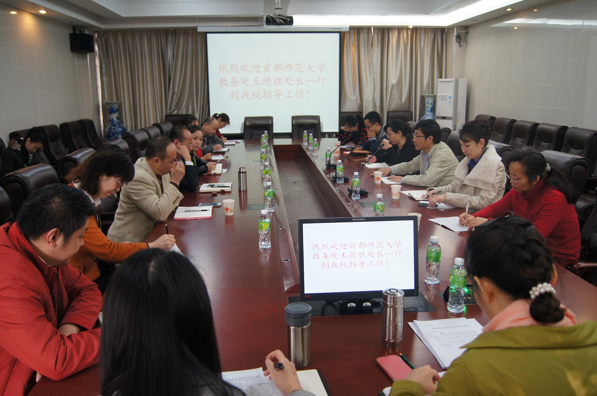 12月29日上午,首都师范大学教务处一行人在王德胜处长的带领下来到我校交流访问。我校教务处梁广处长,陈焕东、赵菊梅副处长以及各科室有关负责人参加了交流座谈会。