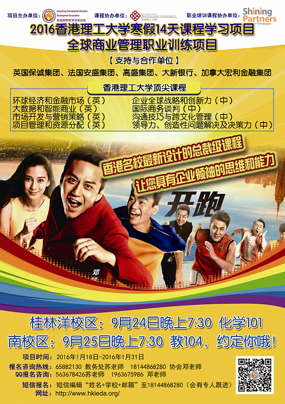 根据我校与“ 香港国际教育发展协会” (简称“ IEDA” )签署的协议规定,2016年寒期将继续选派学生参加“ 香港理工大学课程学习” 项目,时间为14天(2017年1月18日 - 1月31日(暂定))。现将有关事宜通知如下: