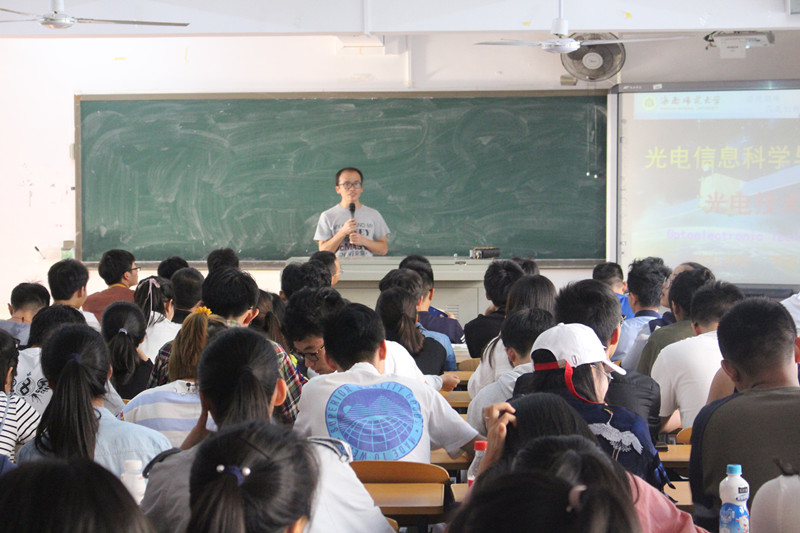 本次讲座共分为三大部分。首先,由辅导员李冰老师为2017级新生介绍本次讲座的主讲人李再金老师及其在专业方面的主要成就。其次,李再金老师为2017级新生讲解了我院在光电技术方面的研究程度和优势,以及光电技术学科学习课程,光电技术概论和发展史等等,并为2017级新生详细的讲解了光电技术在全球范围的重要性和在我国光电技术的现状和发展前景。最后,李再金老师总结说明,光电技术在我国的就业前景十分广大,希望同学们都珍惜大学的美好时光,努力学习,拥有更好的发展前景。