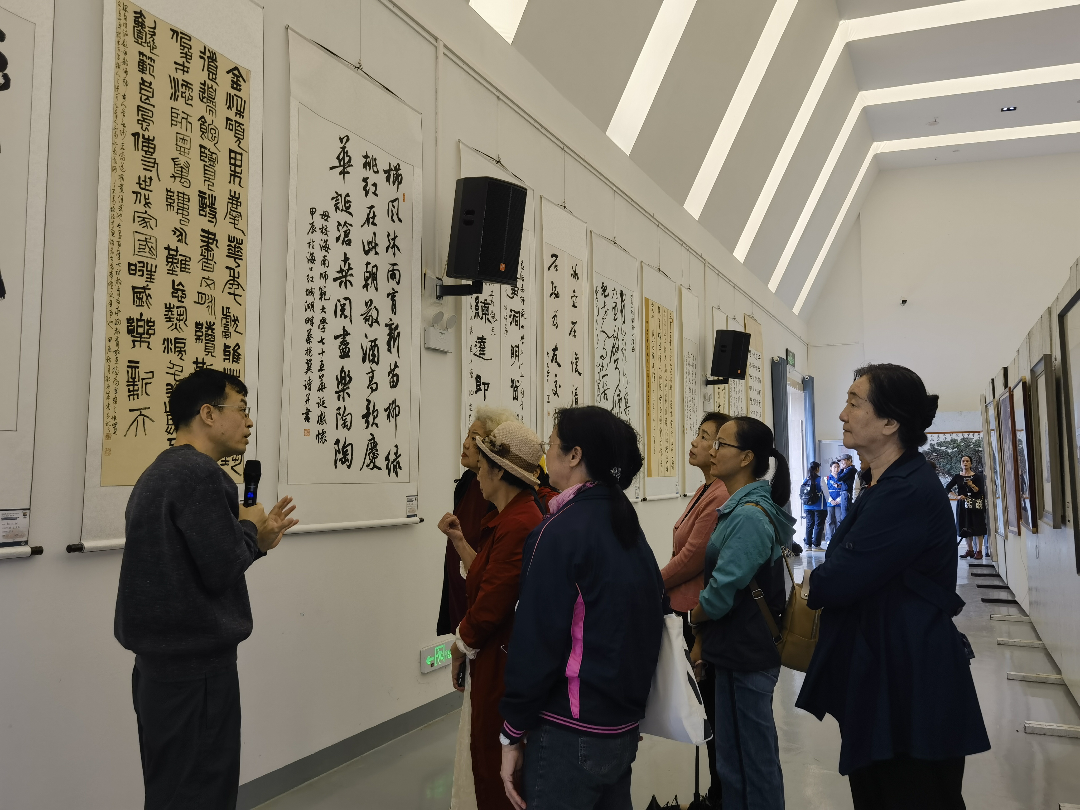 走出校史馆,全体人员来到美术馆的“笔墨丹青·光影传情”校庆书画摄影展。参观过程中,大家频频驻足,热烈讨论,指点熟悉的历史画面,重温学校筚路蓝缕的办学历程,述说学校日新月异的变化,展望学校未来发展的宏图愿景。