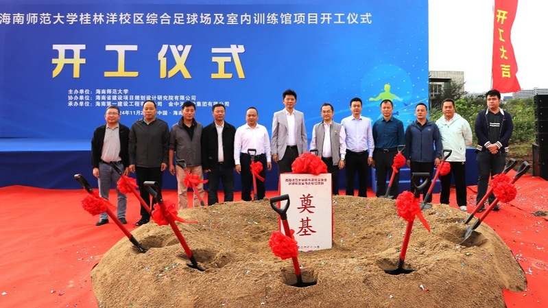 11月26日上午,我校在桂林洋校区举行综合足球场及室内训练馆项目开工典礼。校党委副书记符刘才,校党委常委、副校长张引,海南省建设项目规划设计研究院有限公司党委书记、总经理谭玉平,海南第一建设工程有限公司总经理卓海雄,金中天建设集团有限公司总经理林润标出席,体育学院、足球学院全体领导、教师代表及学生代表参加开工典礼。