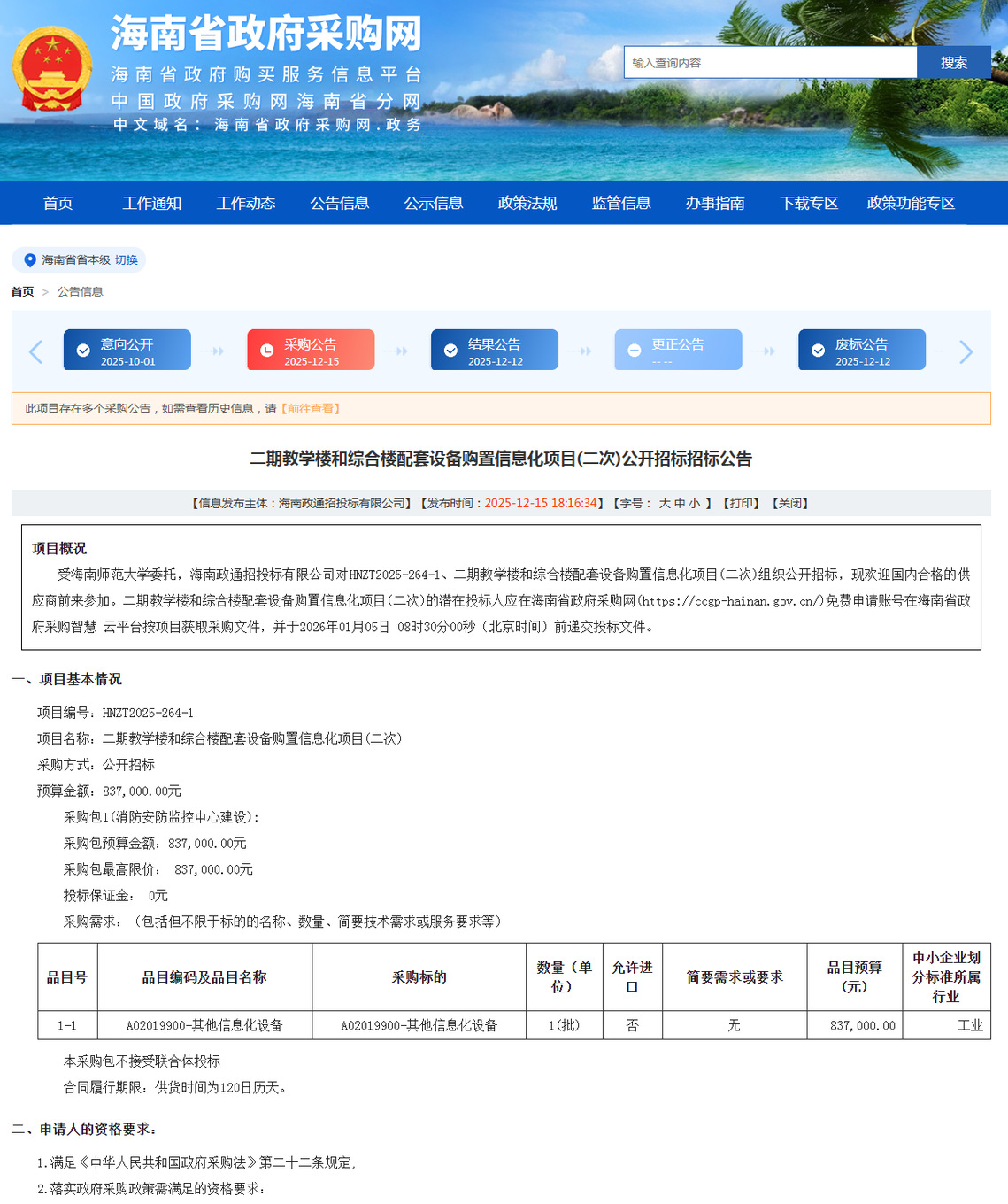 公告链接:https://ccgp-hainan.gov.cn/maincms-web/articleHn?type=notice&id=08ec9d28-2931-4be8-805c-f8ff708a6fa2&planId=8a1d1e2b99f2a0210199ff93549602a5&channel=c5bff13f-21ca-4dac-b158-cb40accd3035