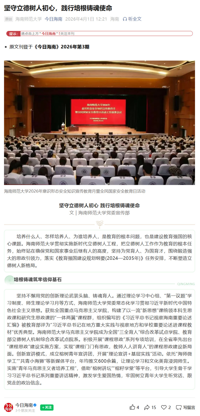 4月1日,《今日海南》刊发我校党委常委、党委宣传部部长程掀,副部长胡长青教授文章《坚守立德树人初心,践行培根铸魂使命》。