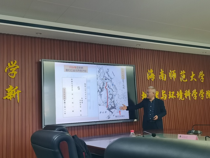 金石柱教授作题为“图们江航运历史地理”的学术讲座。他通过查阅历史文献资料,剖析图们江自古以来在交通运输中的重要作用,并指出中、俄、朝三国对当下图们江开发利用的重视。