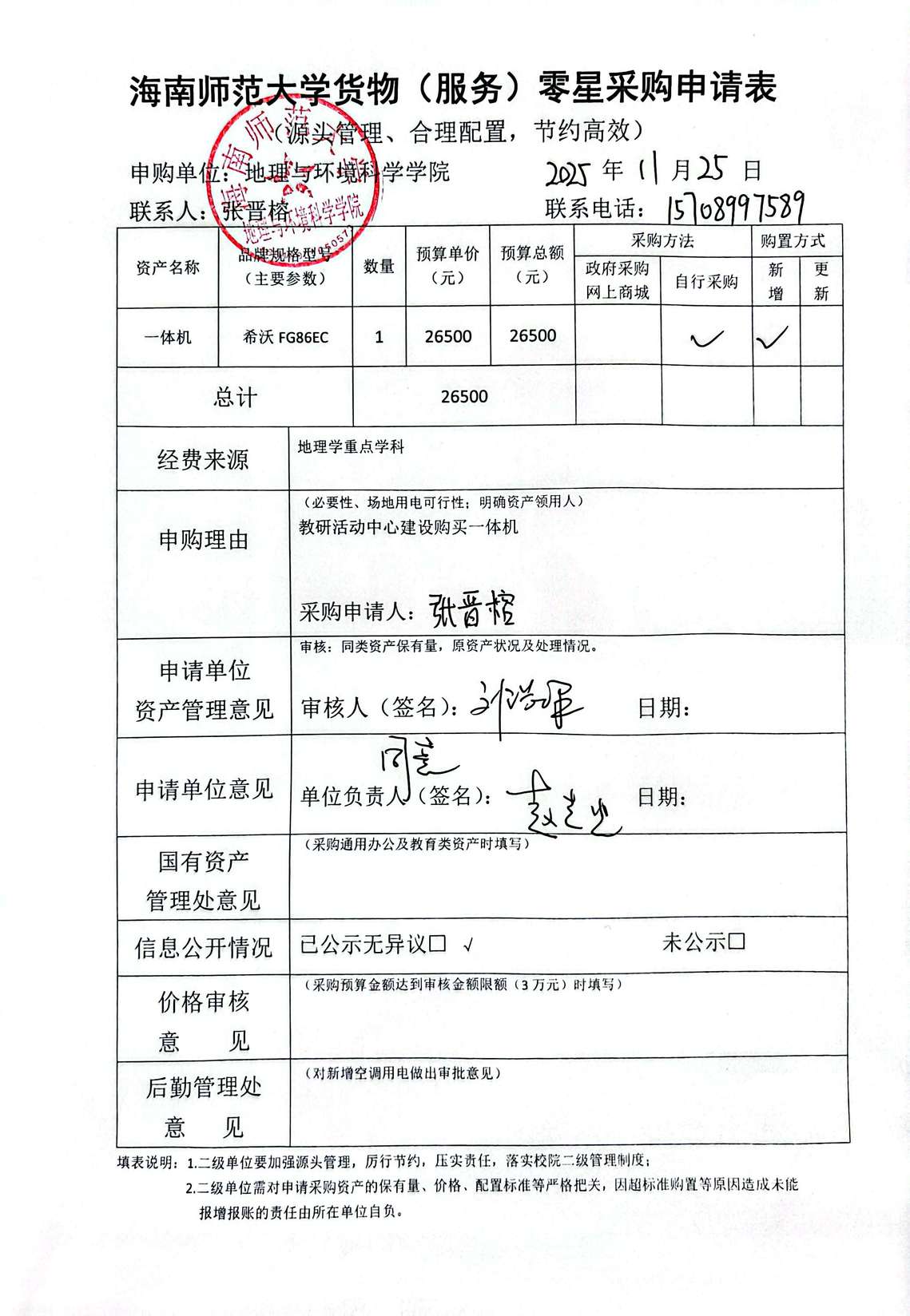 星空游戏官方地理与环境科学学院张晋榕老师设备采购公示