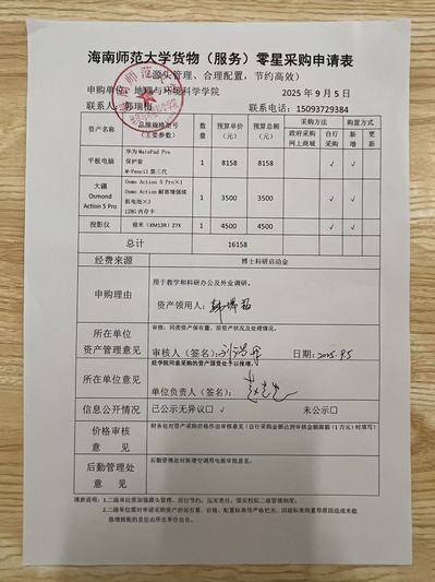 星空游戏官方地理与环境科学学院韩瑞梅老师因教学科研工作需要,拟采购大疆相机一套、平板电脑一台。现予以公示,公示期为2025年9月5日—2025年9月7日。
