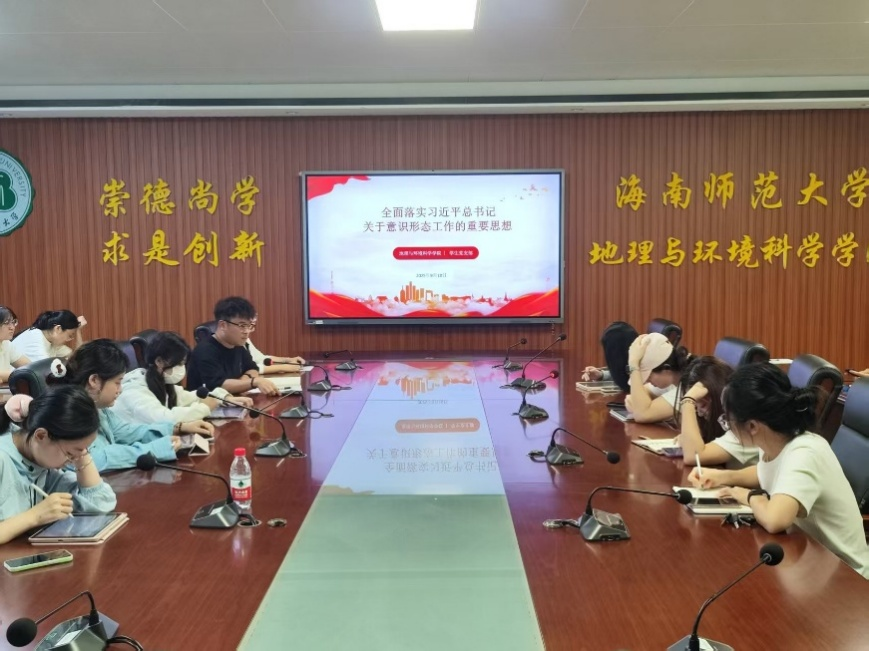 为进一步深入学习贯彻习近平新时代中国特色社会主义思想,重点学习习近平总书记关于意识形态工作的重要论述的核心要义,切实增强意识形态安全风险防范意识,确保校园政治安全,2025年9月18日,地理与环境科学学院学生党支部于地理楼会议室开展意识形态专题学习会,本次活动由学生党支部书记王宇翔老师领学,全体学生党员参加。