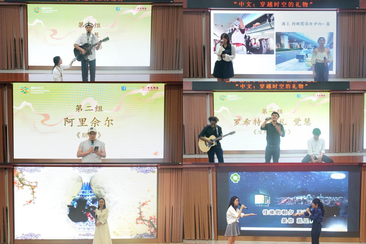 国际中文日线下活动共设中外学生演讲朗诵比赛、留学生中文歌曲比赛两项活动。赛中,留学生选手们以声诵情,一展对中文、对中国的热爱。陈緻蔚同学的《隔世的传承》叙说了蕴藏在中文里的血脉传承和浩瀚文明;曲美丽同学的《再别康桥》独具神韵,赢得现场观众阵阵掌声。国内选手们以言叙志,体现中文魅力。王秀瑾、侯文丽等同学借助演示文稿,生动诠释了跨越时光的中文美韵,表达了以教促传,让中文走向更广阔天地的美好愿景。