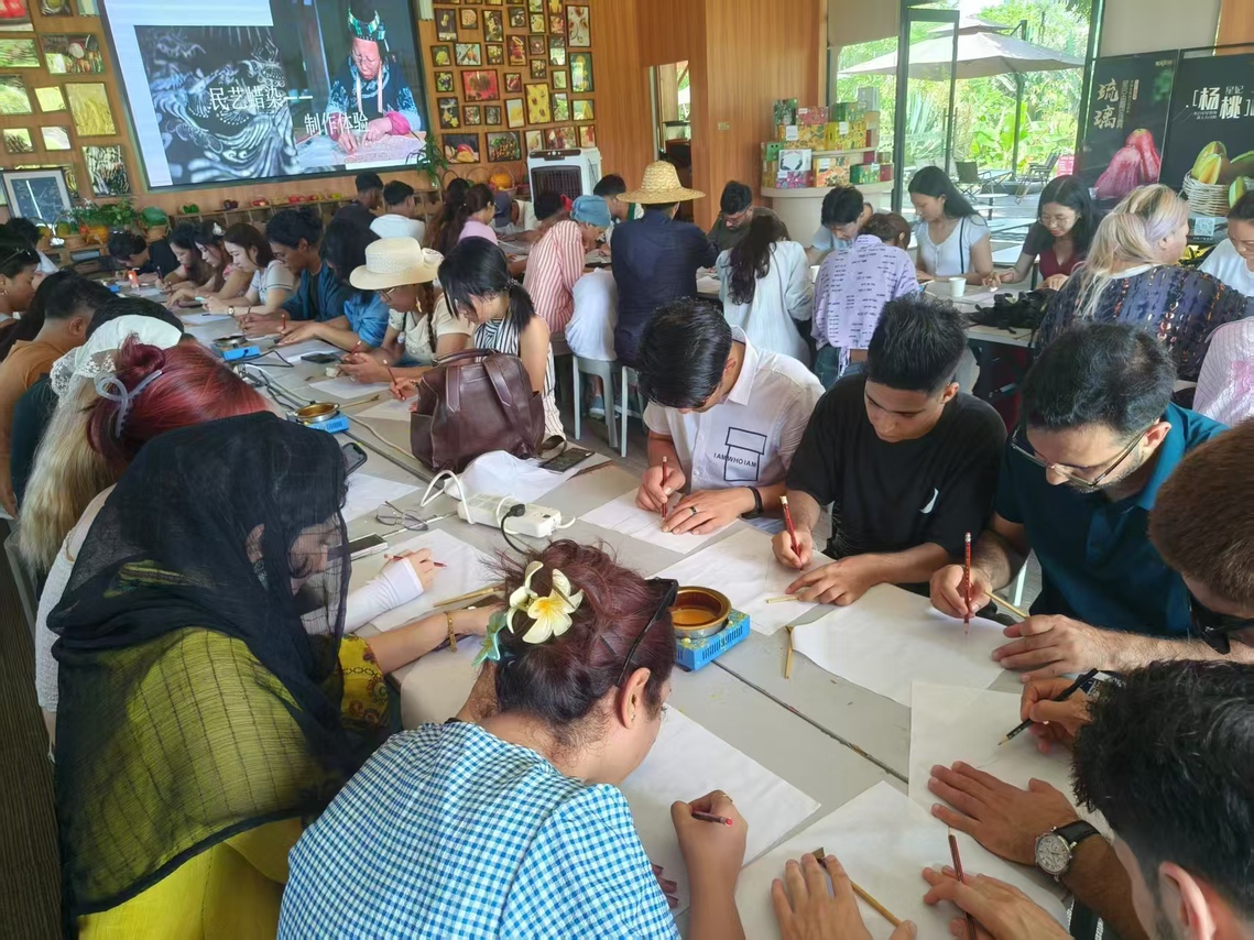 活动第三站是参观云舍松涛.中国村,留学生漫步于广袤的田野间,热带农业景观尽收眼底。同时,留学生们对非遗手艺的学习尤为投入。非遗花扇制作中,在非遗传承人的指导下他们精心勾勒扇面,感受传统工艺的细腻与精巧;黎苗蜡染课程里,留学生们亲手绘制图案,看着白布在染料中逐渐染上绚丽色彩,体会古老民族的独特审美和智慧。而割胶体验则让留学生们了解到橡胶树的重要性,以及割胶这一传统技艺的操作方法和意义。通过此次参观,留学生们不仅深入学习了非遗手艺,更深刻感受到非遗文化的魅力,在实践中传承传统文化。