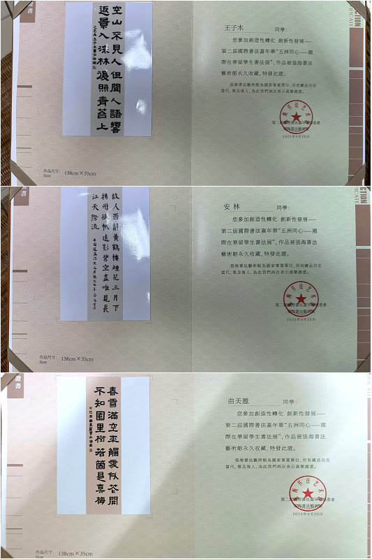 “国际书法嘉年华”已逐步成长为新时代书法领域的重要品牌,在国内外文化圈影响力持续扩大。我院学子此次参展,既是对自身研习成果的有力证明,更以墨香为语、以纸绢为舟,在全球化语境下为中华文化书写当代篇章,为文明互鉴注入青春力量。
