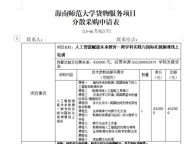根据学院2025年度“人才建功自贸港”行动项目任务要求,须采购人工智能赋能未来教育—跨学科实践与国际化视频课线上培训。特申请购买。经费来源为学院发展资金。