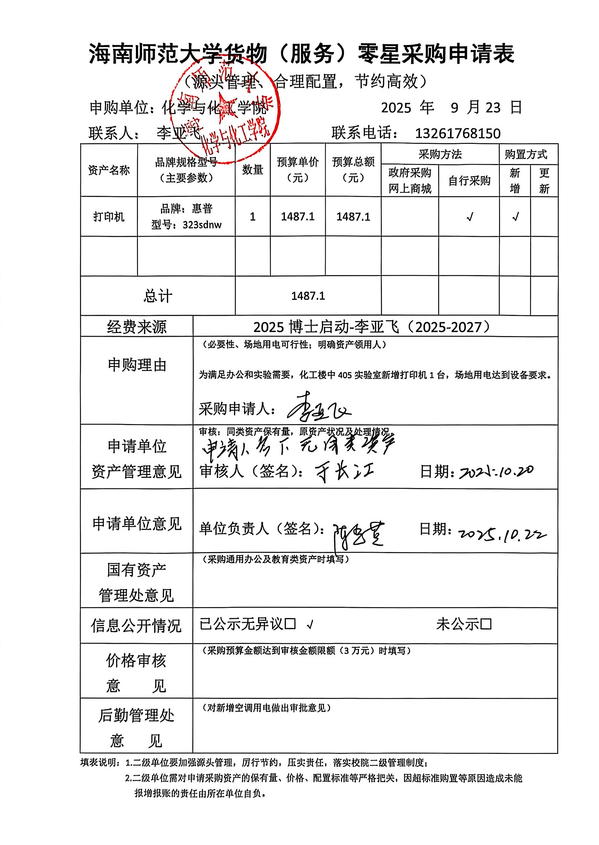 因日常办公需要,中405实验室拟购买打印机1台,现公示如下: