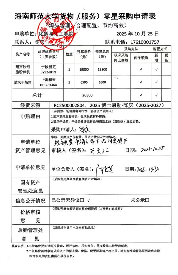 因科研工作需要,拟购买超声波细胞粉碎机1台、鼓风干燥箱1台,现公示如下: