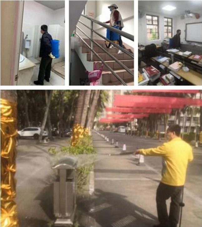 他每天都坚守在抗击疫情的第一线,指挥工作人员工使用氯清净药物按比例配水,配备电动喷雾机,每天对公共卫生间水龙头、门拉手、地面、洗手盆、尿斗、坐便器、门窗、垃圾房、校园垃圾箱、水沟及教室等进行全面消毒,确保公共区域防疫“无死角”。在对教室消毒和封闭管理工作中,一些留校学生不理解,他耐心教育劝离,防控措施落实到位。