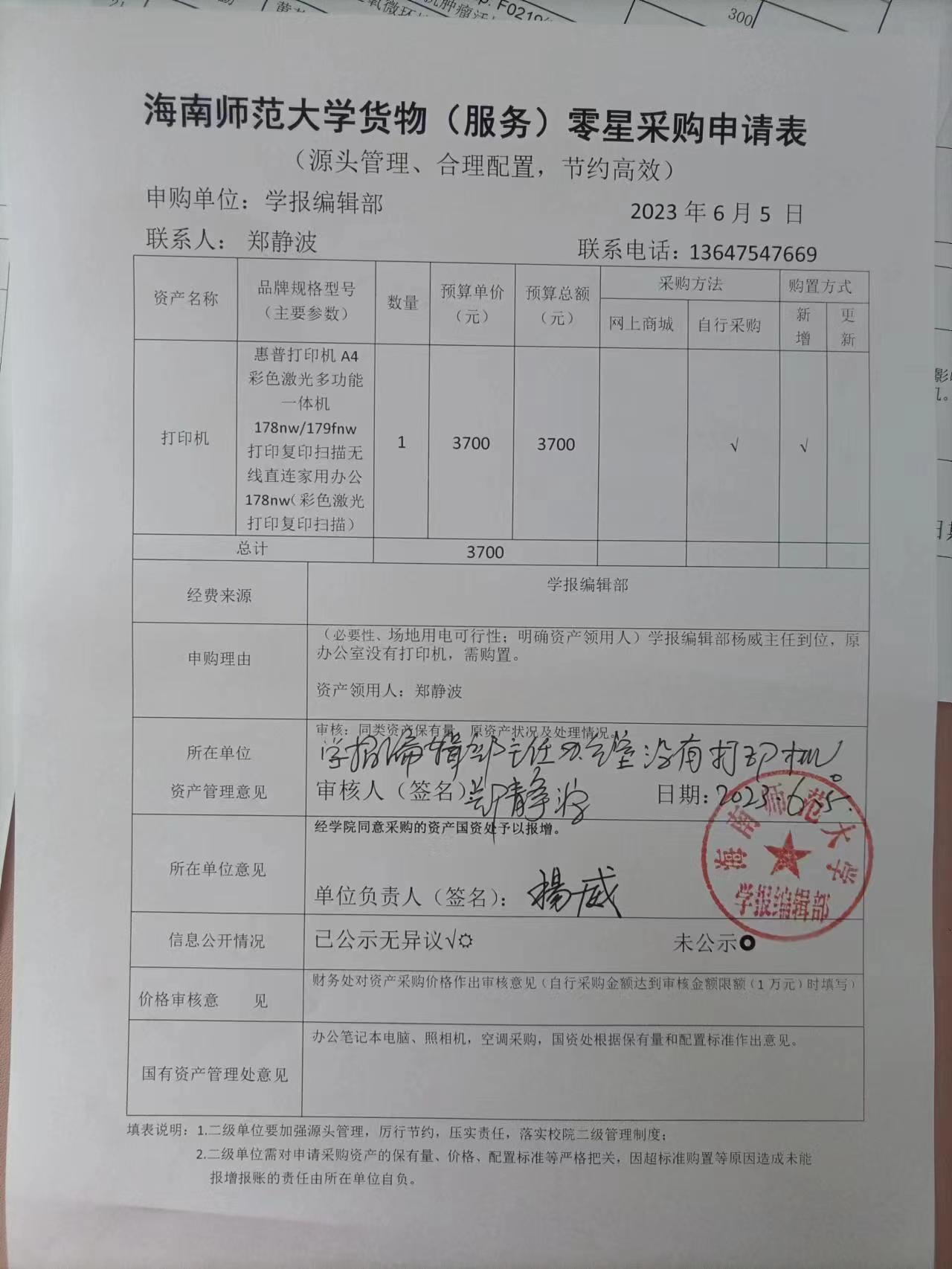 学报编辑部购买打机一台,现进行公示,公示期2023年6月5日至7日,如有异议,请致电,65883414.