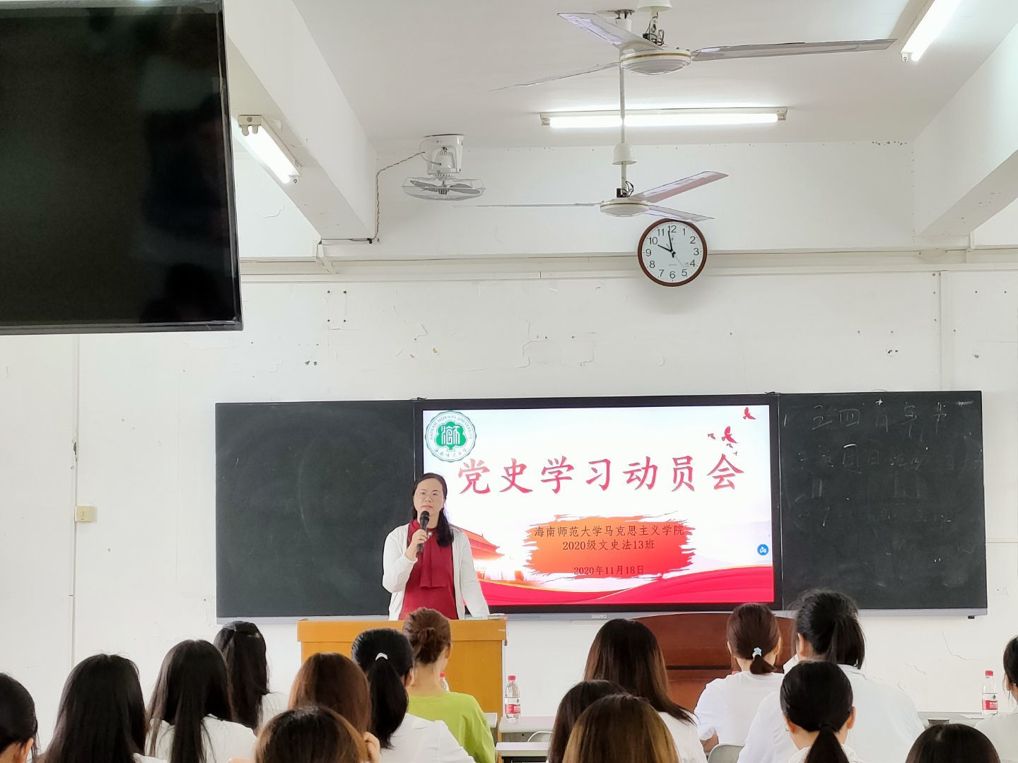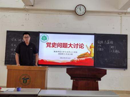 2020年11月18日,王云华老师开展了党史学习动员大会,号召大家开始进行党史方面的学习,向同学们提出对党史学习的基本要求,并于寒假前夕,鼓励大家通过自主阅读“四史”书目,观看《毛泽东》电视剧等方式学习党史知识。2021年3月11日,以“学史明理、学史增信、学史崇德、学史力行”为主题的党史读书报告会正式拉开序幕,其中共分为八组四场举办,另外还举办了两场有关党史问题的主题班会。期间有幸邀请到程掀、向广宇、李哲漫、霍知节、李岩、高昕等6位老师作为评委嘉宾出席报告会,读书报告会多采取授课式研讨会、互动式研讨会、主讲人汇报和模拟讨论课堂的多种形式进行。八个小组分别根据不同主题进行了学习与汇报。4月4日清明节,王老师带领同学们前往海南省海口市琼山区琼崖红军云龙改编旧址和冯白驹故居,追思英雄,缅怀先烈,瞻仰祭扫。“清明祭英烈”主题教育活动让青年学子们感受到了在腥风血雨的年代,英烈们为保卫山河抛洒热血,献出宝贵生命的崇高革命精神。4月8日,组织同学们开展了一场“批评与自我批评”的主题班会,深入学习我国党史上延安整风运动及其在同学们中开展了深入的批评与自我批评。5月13日,该班组织了一场党史问题的大讨论,在这次大讨论中同学们提出自己在阅读党史中遇到的疑惑点并阐述自己的观点,王老师对同学们的问题进行了学理的解答,使大家对党史有了进一步深刻的了解。6月4日,班级组织了线下的党史知识竞赛,大家答题迅速,正确率较高,同学们的学习积极性较高。