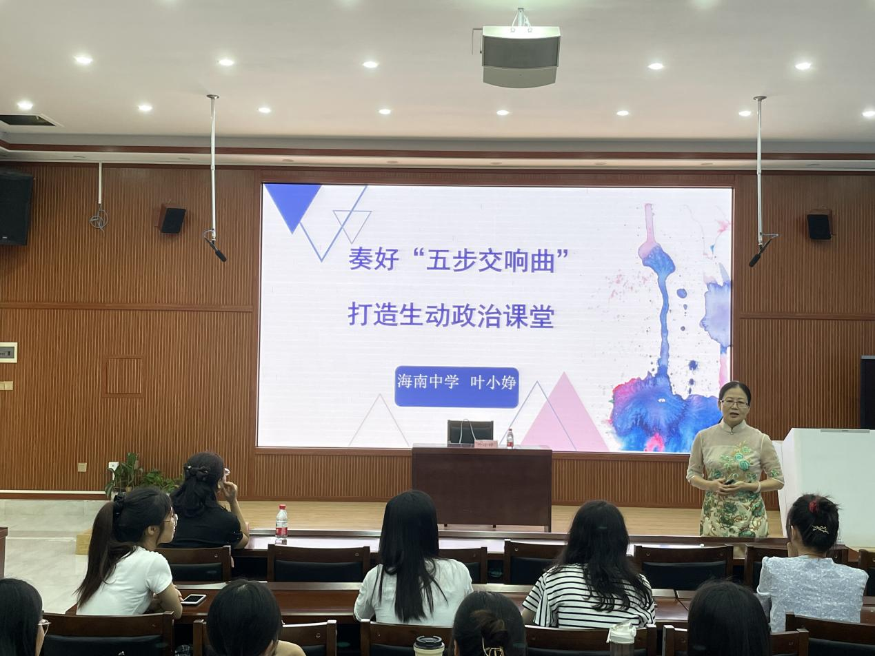 其次,叶小婙老师从理论和实践两个层面为即将参加实习工作的同学传授了自己的教学心得。一方面,叶小婙老师从五个部分讲解了高中政治教学理论的具体要求:一是“研究课标,明晰要求”;二是“吃透教材,宏观把握”;三是“研究学情,确定教法”;四是“精选素材,巧设问题”;五是“总结提升,落实素养”。另一方面,叶小婙老师通过自身的教学案例为同学们阐释了课程要求在高中政治课中的功能与作用,以帮助与会同学更好地成为一名合格的高中政治教师。