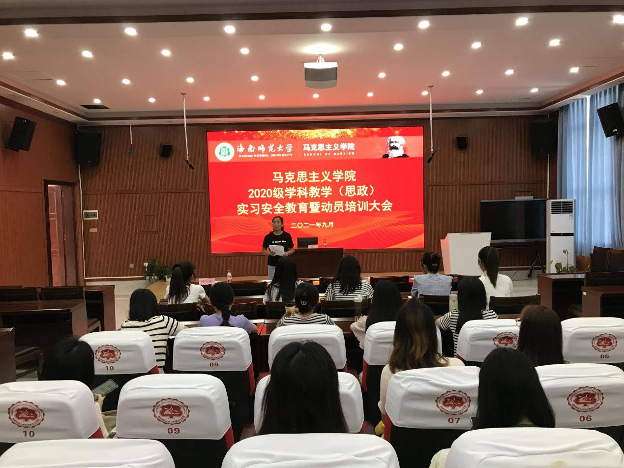2021年9月16日下午2点30分,马克思主义学院在马院大楼201报告厅举办了2020级学科教学(思政)实习安全教育暨动员培训大会,马克思主义学院陈红副院长、知名校友海南中学高级政治教师叶小婙以及2020级学科教学(思政)全体同学参与了这次活动。