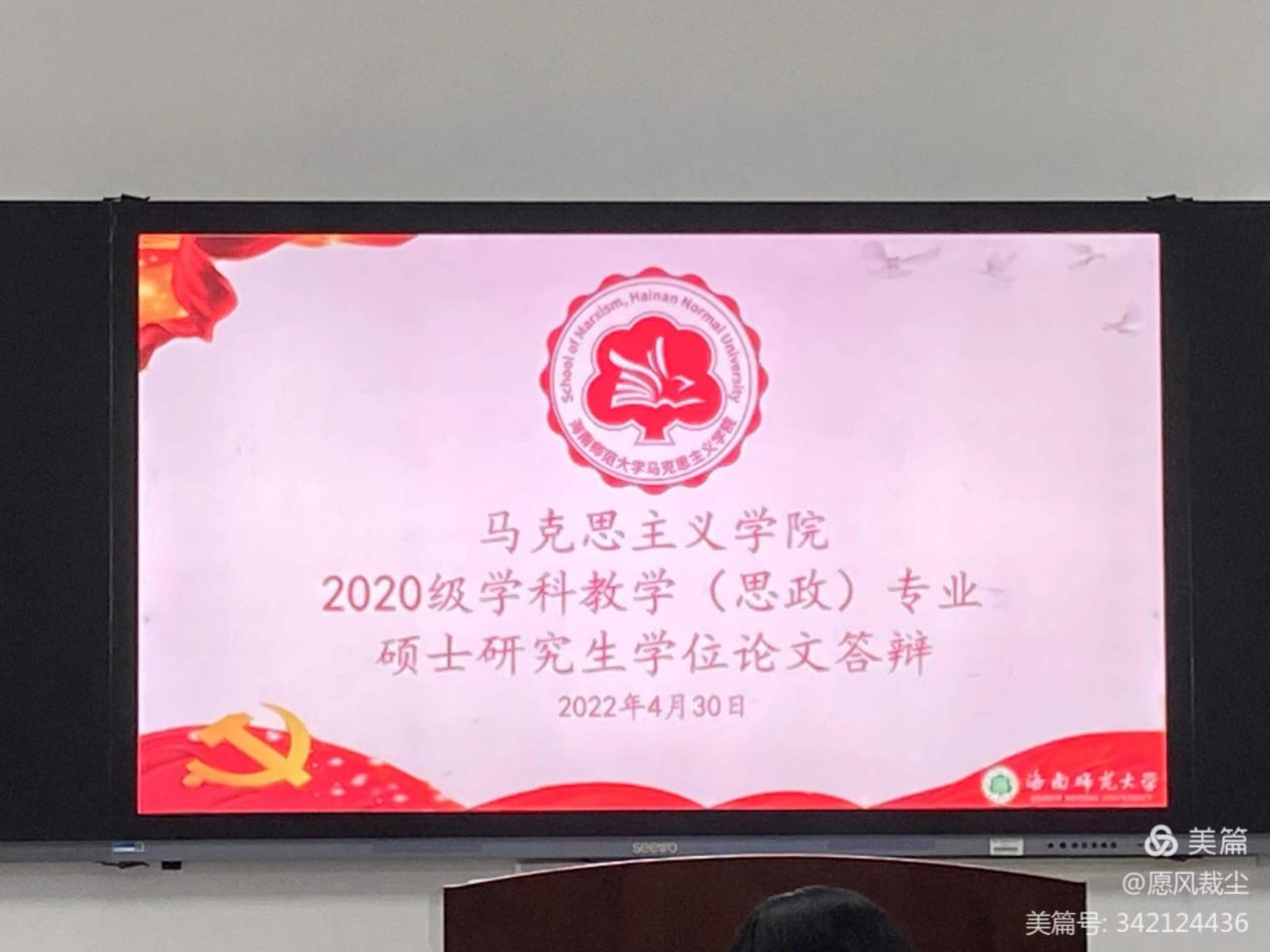 为进一步提高我校硕士论文质量,激励硕士研究生致力于高水平、高质量的论文研究。2022年4月30号上午,星空游戏官方马克思主义学院2020级学科教学(思政)硕士学位论文答辩会于马院507教室隆重举行!本次答辩委员会由海南省教育研究培训院李洪山副院长、海南农垦中学刘红禄老师、星空游戏官方马克思主义学院兰岚老师、陈连珠教授、刘湘平副教授、董前程副教授和张欢老师组成,李洪山院长担任答辩主席,陈连珠教授主持答辩会。2020级学科教学(思政)15位硕士研究生参与答辩,其中5位硕士研究生进行线上答辩,2021级学科教学(思政)硕士研究生学习旁听。