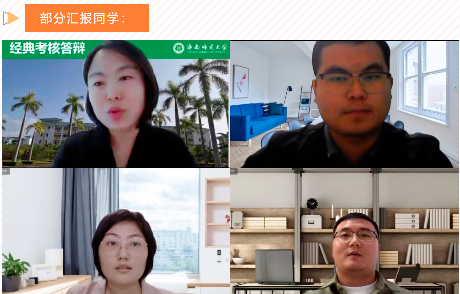 2021级博士研究生通过ppt汇报个人阅读经典著作情况,考核专家对每位同学的汇报予以点评。综合三组同学汇报整体状况,主要提出了四点建议:第一,经典著作的文本选择要注重质量,加强专业性和理论性。第二,经典著作的心得总结要有始有终,明确出发点和落脚点。第三,经典著作的文本学习要增强针对性,不能脱离个人的研究方向。第四,经典著作的学习汇报要注重细节,在文本布局、段落层次和引用资料等方面务必精准。