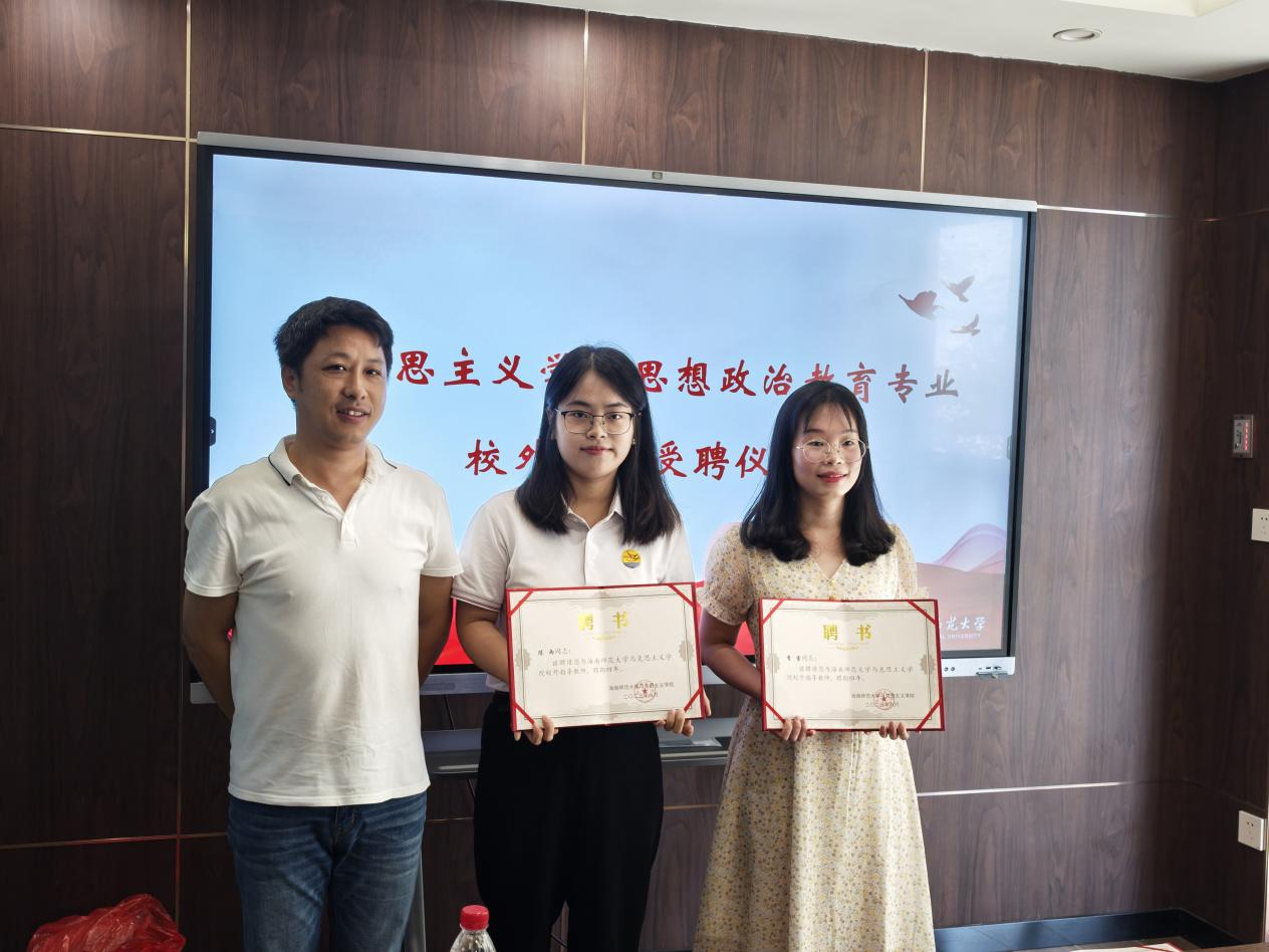 我院党委书记兰岚、副院长谢丹及校友会理事朱韫为新加入的校外导师陈婵娟、唐斌、陈春柳等颁发聘书,对其表 示热烈的欢迎和由衷的感谢。希望校内外互融互通,齐心协力提升思想政治教育本科师范生培养质量,为国家的人才培养与海南自贸港的教育事业贡献力量。