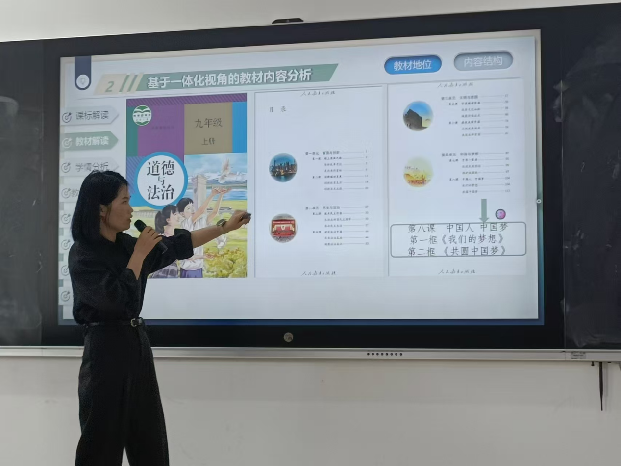 初中学段注重八维框架构建系统性教学分析能力,董德晶老师结合初中思政课教学实例,从课标解读、教材逻辑、学情诊断、目标设定、重难点突破、教法学法融合、教学过程创新及教学反思优化八大维度,系统剖析了初中教学设计的关键环节。针对初中学段学生思维进阶的特点,她强调“从具象案例到理论提炼”的阶梯式引导策略,并展示了如何将时政热点嵌入课堂以增强课程时代性。“教学设计不仅是教案撰写,更是对课程标准、学科核心素养与学情的三重回应。”董老师以“法治专题单元”为例,详解如何通过案例辨析、角色模拟等多元方法,帮助初中生实现从道德意识到法治思维的跨越。