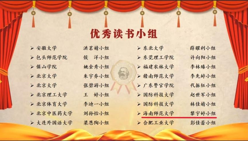 金秋送爽,硕果盈枝。在近日圆满结束的中国高等教育学会马克思主义研究分会2024年度“马克思主义经典著作研读”资助计划评选中,海南师范大学《中国共产党的一百年》读书小组凭借其卓越的表现与丰硕的成果,成功通过项目结项并荣获“优秀读书小组”称号,小组指导教师申明远荣获“优秀指导教师”。