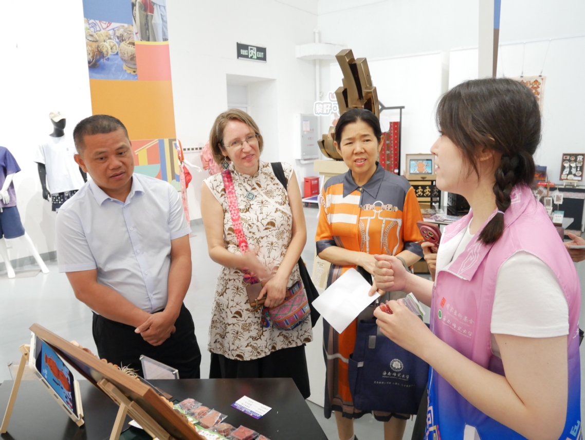 展览活动现场设置的互动体验区吸引大批参观者驻足,专业讲解员现场讲解黎族织锦、原始制陶和藤竹编三项非遗技艺,藤竹编传承人现场指导观众学习藤编基础技法。展览通过实物展示、工艺流程图解和多媒体演示相结合的方式,注重让观众了解制作过程和文化内涵,全方位呈现黎族手工艺的制作技艺。