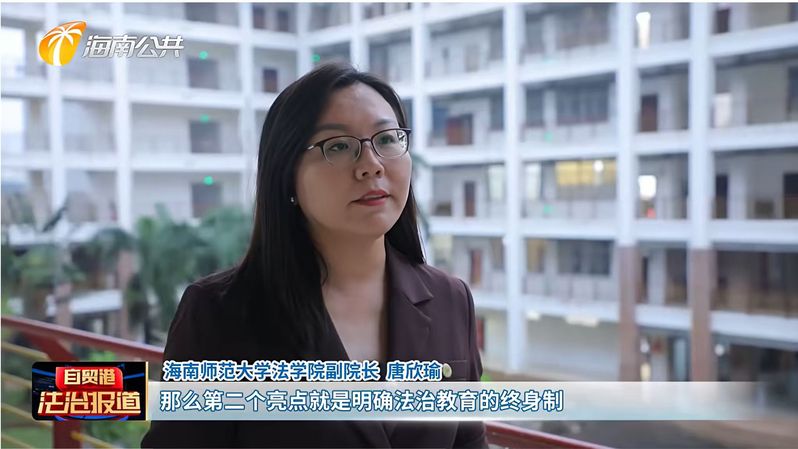 11月3日,我校法学院副院长、副教授唐欣瑜接受海南广播电视总台采访,解读今年11月1日正式施行的《中华人民共和国法治宣传教育法》亮点及对社会公众的影响。该节目于11月3日晚20:00在海南公共频道《自贸港法治报道》栏目播出。