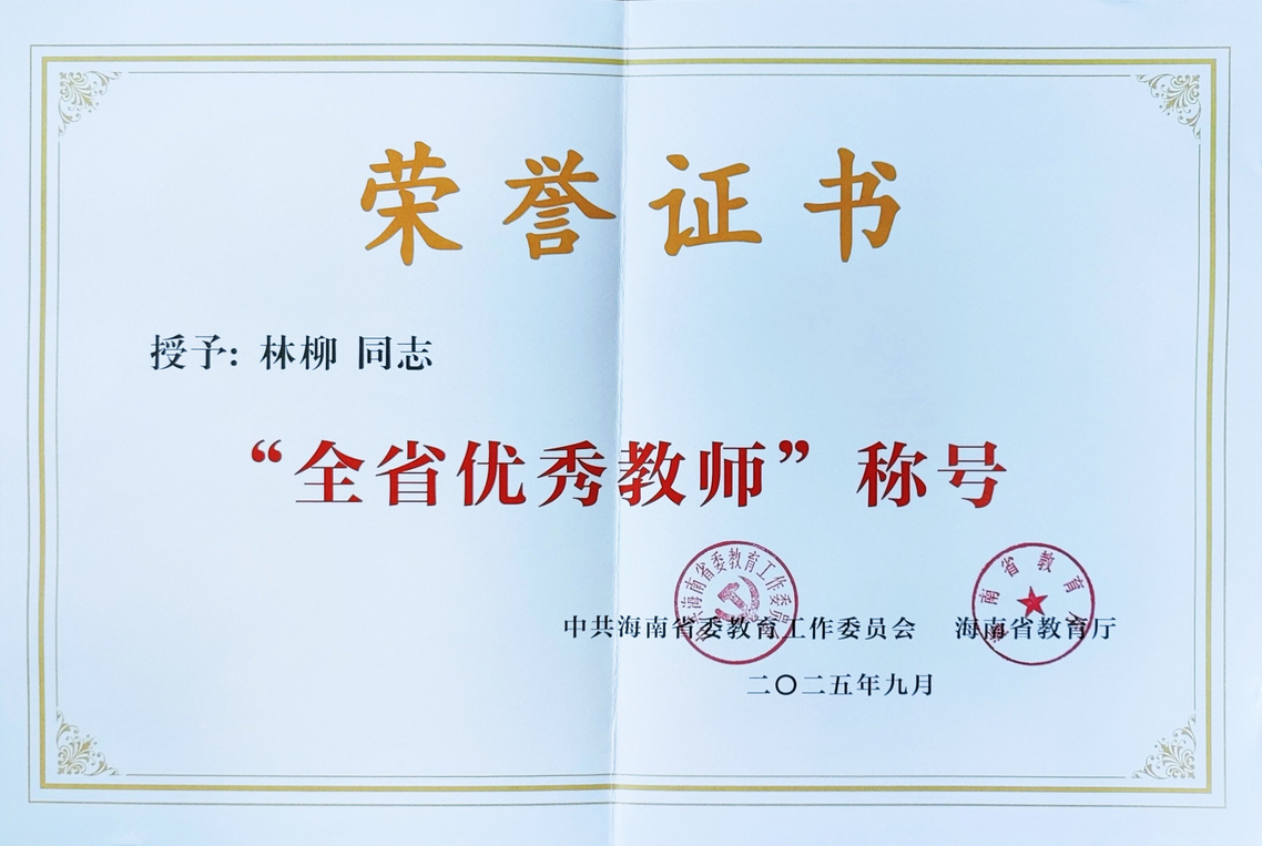 在第41个教师节来临之际,为激励广大教师和教育工作者,中共海南省委教育工作委员会、海南省教育厅对2025年“海南省优秀教师”“海南省优秀教育工作者”进行表彰。我院林柳老师获评“海南省优秀教师”。