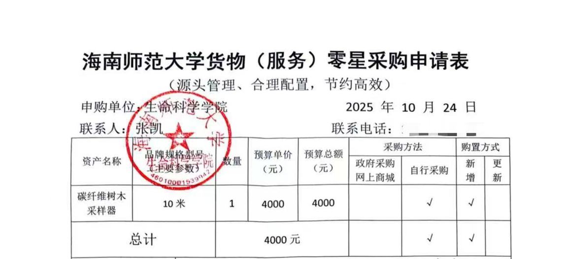 因个人科研工作需要,需购置碳纤维树木采样器1台。根据学校相关规定,现将具体采购信息公示如下: