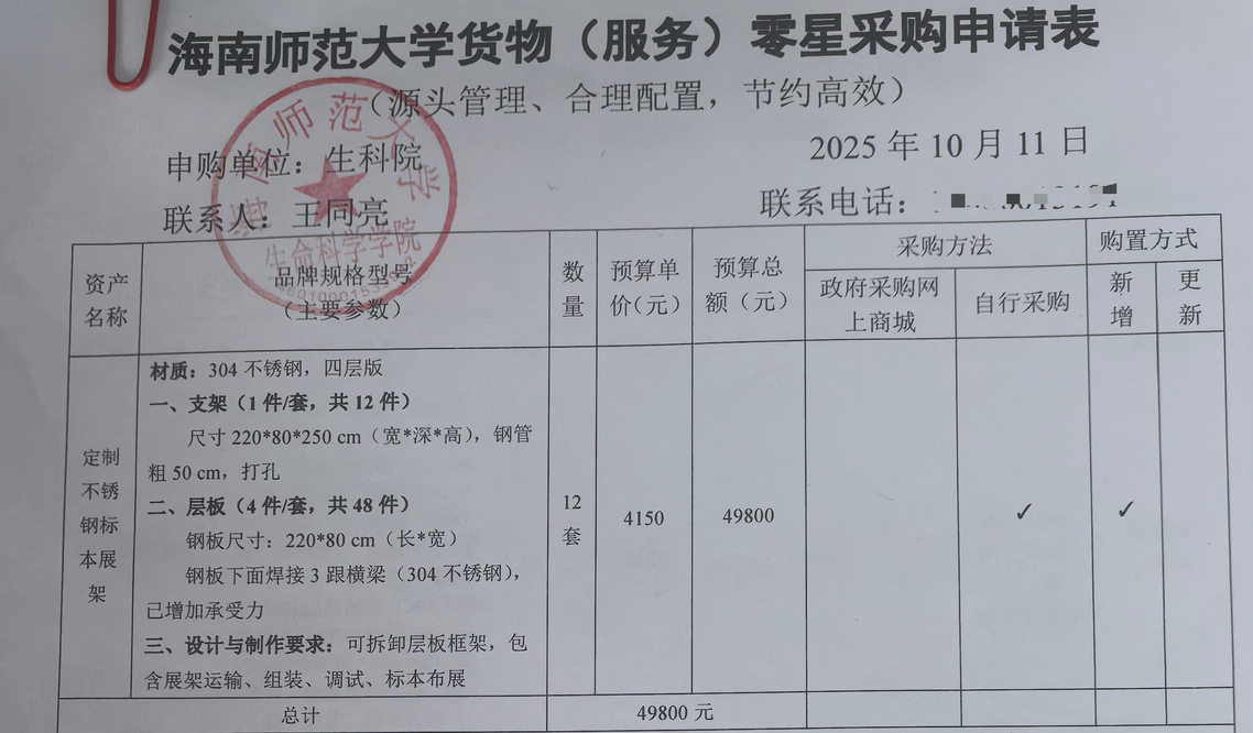 因博物馆工作需要,需购置定制不锈钢标本展架12套。根据学校相关规定,现将具体采购信息公示如下: