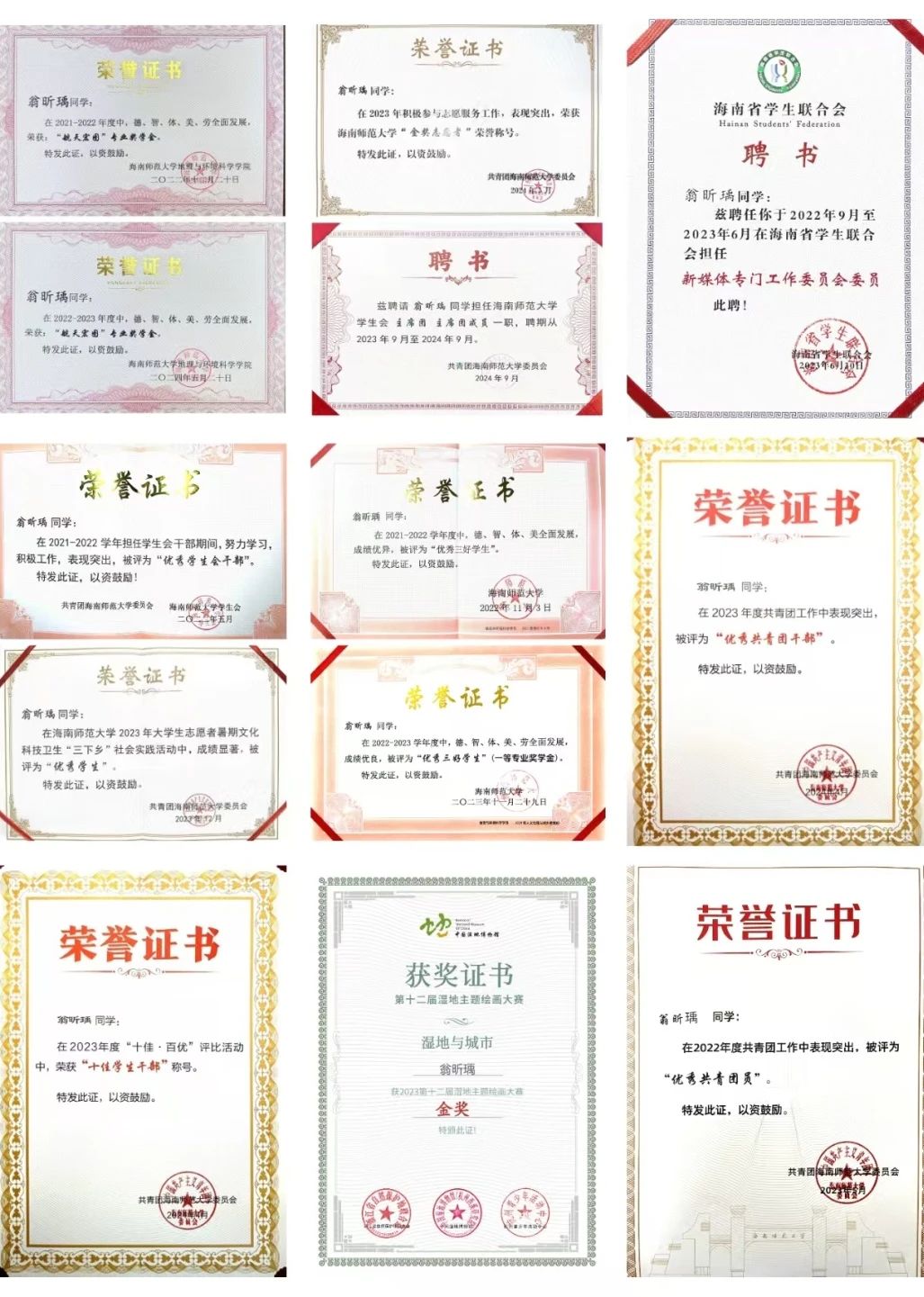 翁昕瑀,女,中共党员,星空游戏官方地理与环境科学学院2021级学生。曾任校学生会主席团成员一职、海南省学生联合会新媒体专工委委员、中国地理学会研究生分会视觉设计岗志愿者、院学生会部门负责人、班级副团支书兼青协委员。曾获校级一等奖学金、航天宏图奖学金;获评“优秀学生会干部”、“优秀三好学生”、“优秀共青团员”、“金奖志愿者”以及在2023年大学生志愿者暑期文化科技卫生“三下乡”社会实践活动中获“优秀学生”等荣誉。在2023第十二届湿地主题绘画大赛中荣获金奖,此外还是《国土空间规划视角下海口市旅游空间结构优化研究》国家级大创项目负责人和《港口城市城镇化与港口物流系统之间的协调发展关系以海口为例》国家级大创项目成员。专业必修课平均学分绩点3.86,专业排名1/34。现已推免至中国科学院大学。