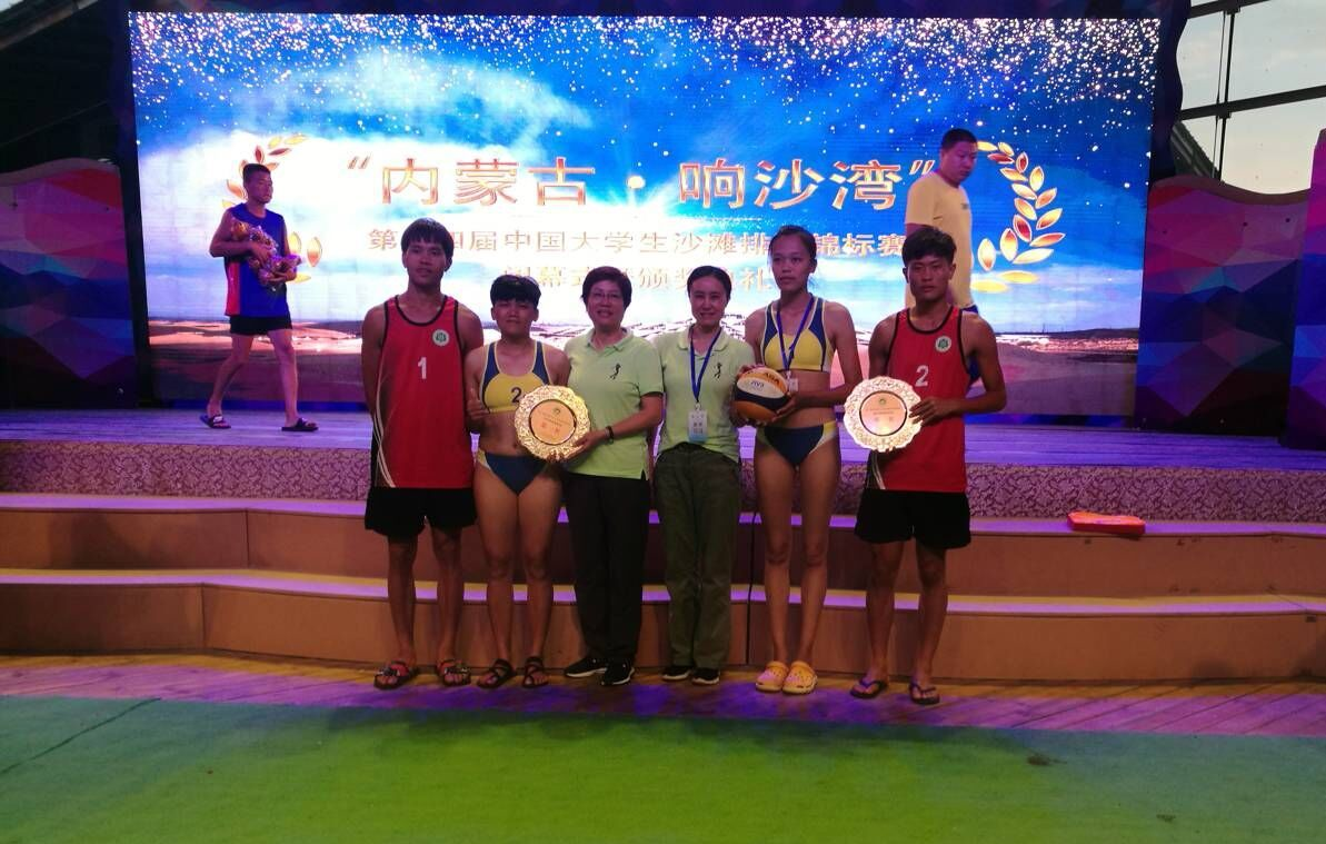 7月14日至18日,中国大学生第十四届中国大学生沙滩排球锦标赛在内蒙古响沙湾隆重举行。来自全国47所高校的98支男、女沙滩排球队参加此次比赛。本届比赛共分为专业组、高水平组、体育院系组、阳光组四种类型。我校男女沙滩排球队参加体育院系组比赛,双双获得冠军。