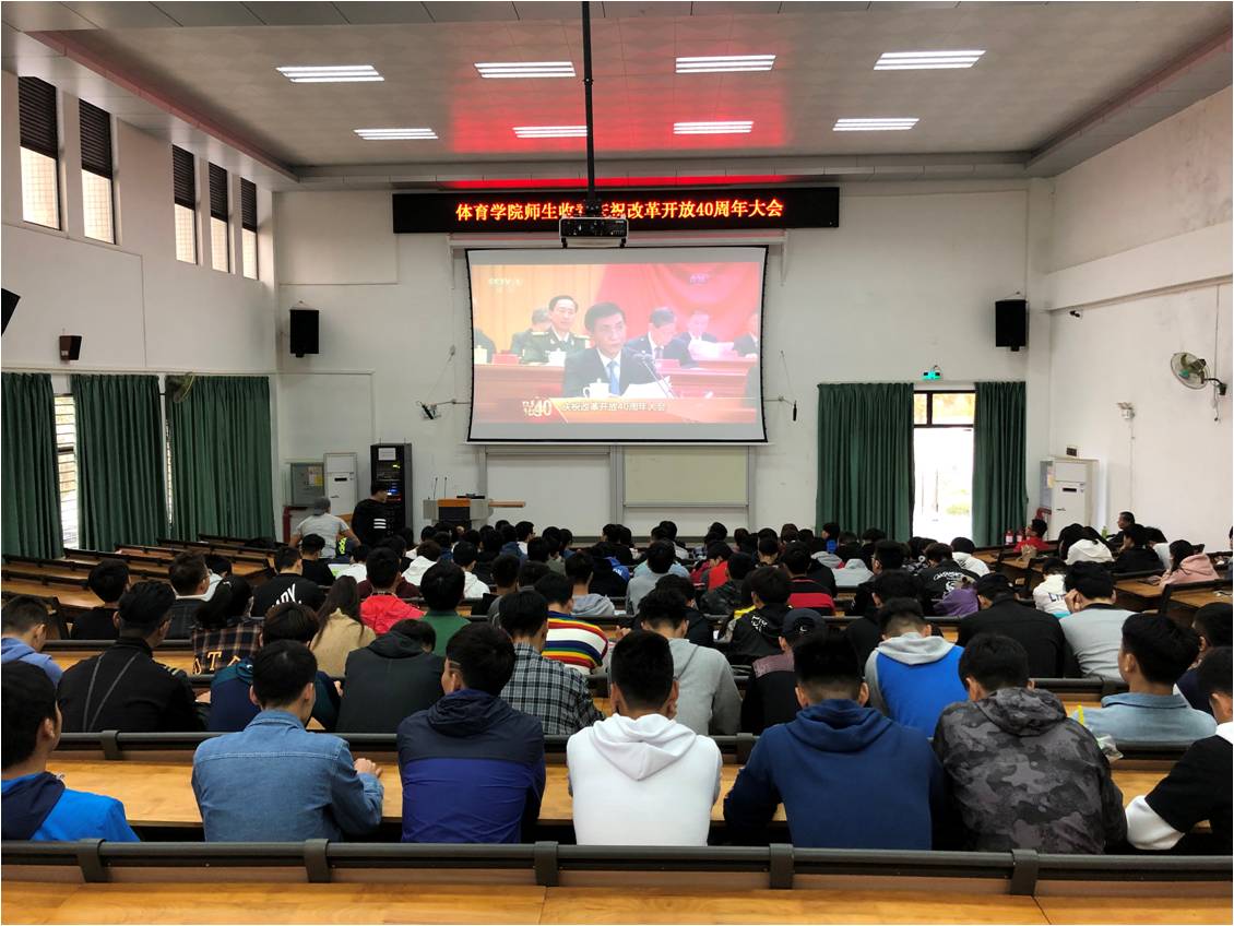 12月18日上午10时,庆祝改革开放40周年大会在人民大会堂开幕,中共中央总书记、国家主席、中央军委主席习近平发表重要讲话。为更好地学习庆祝改革开放40周年大会精神,上午10时,在学校党委的号召组织下,体育学院组织师生党员200余人在体育综合训练馆112教室集体收看庆祝改革开放40周年大会直播。