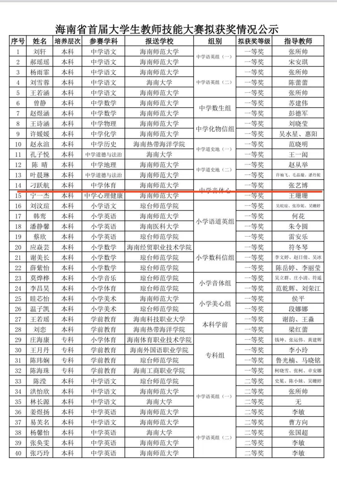 2025年11月23日,海南省首届大学生教师技能大赛圆满落幕。我院学子表现亮眼,刁跃航同学(指导教师张艺博)夺得中学音体心组一等奖第一名,车鸿昌同学(指导教师蔡贯中)荣获该组别三等奖。