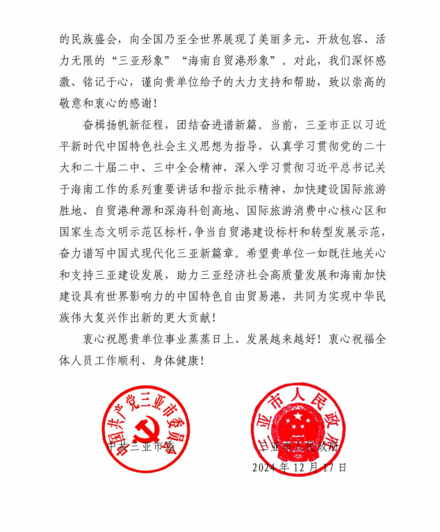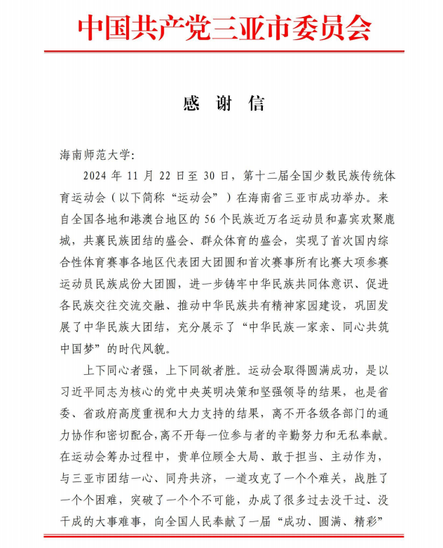 近日,我校收到中国共产党三亚市委员会《感谢信》,感谢学校对第十二届全国少数民族传统体育运动会的支持和帮助。信中肯定了我校工作人员在运动会期间做出的积极贡献,展现了星空游戏官方的良好形象。同时希望我校一如既往地关心和支持三亚建设发展,助力三亚经济社会高质量发展和海南加快建设具有世界影响力的中国特色自由贸易港,共同为实现中华民族伟大复兴作出新的更大贡献!