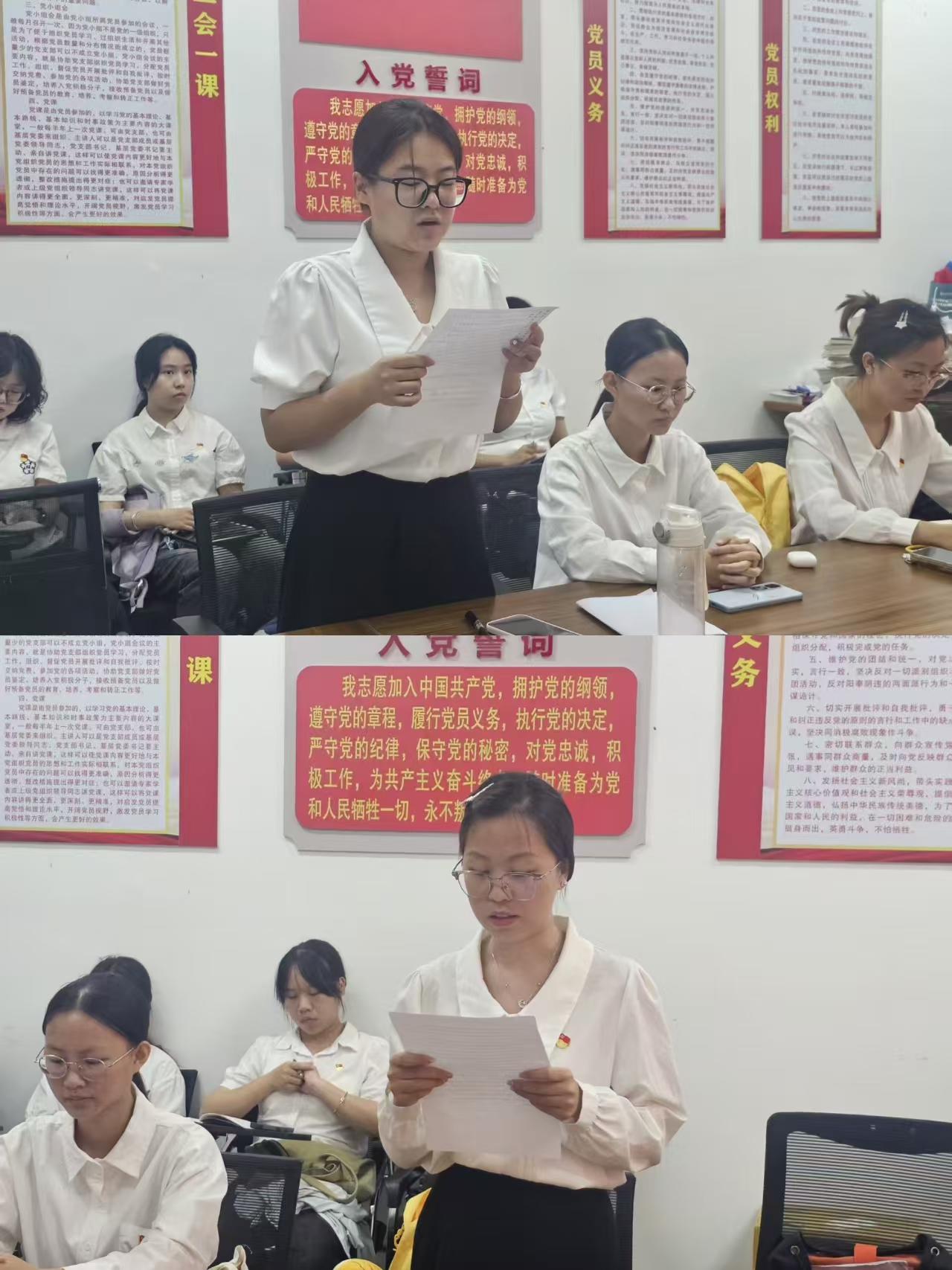在气氛热烈的交流研讨环节,党员们结合自身学习和思想实际踊跃发言。张誉丹同志从文学专业角度分享体会,认为作为未来的教育工作者或文化传播者,要将“家国情怀”融入学习和未来的职业生涯,通过文学作品和课堂内外,潜移默化地引导学生树立报国之志。她特别强调要以“言为士则、行为世范”的标准严于律己,提升个人修养。张世轩同志则分享了如何在日常学习生活中发挥党员先锋模范作用的心得。她表示,要时刻铭记党员身份,在课堂讨论、社团活动、朋辈交流中主动传播正能量,讲好中国故事,将思想政治教育融入点滴言行,带动身边同学共同进步。