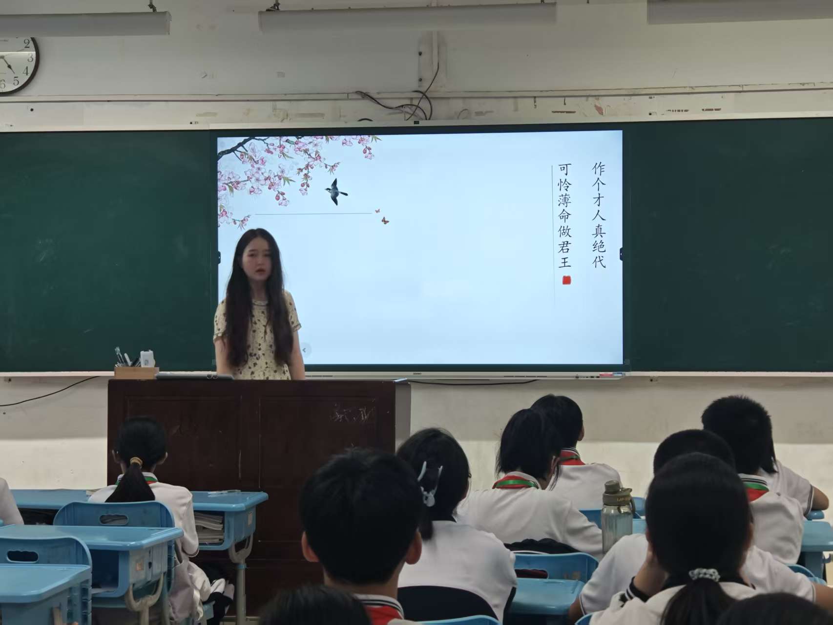 第一阶段,博士研究生党员文坤怿以李煜为主题开展专题宣讲。他通过梳理南唐兴衰与李煜生平轨迹,结合《虞美人》等代表词作,系统阐释了李煜“变伶工之词为士大夫之词”(即将词从乐工娱乐之作提升为士大夫文学形式)的文学史意义,引导学生感受古诗词的韵律美、意象美与文化内涵,增强国学素养。