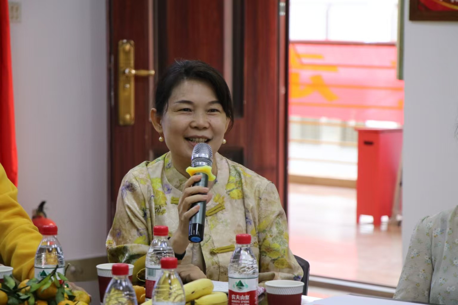 座谈会前,校党委书记许玫到外语楼看望校友,热烈欢迎校友们回母校参加校庆活动,与校友们亲切握手交谈并合影留念。