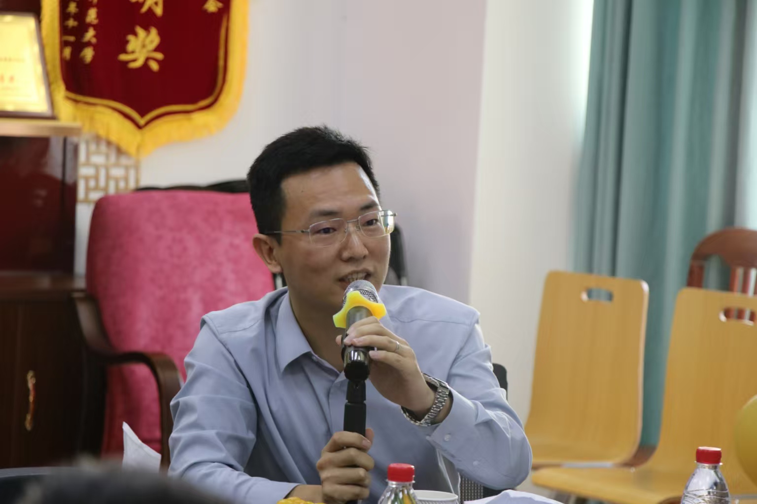 校友座谈会于外语楼二楼党员活动室举行,外国语学院领导悉数出席,与23位校友共同交流。本次会议由外国语学院党委副书记杨白全主持。