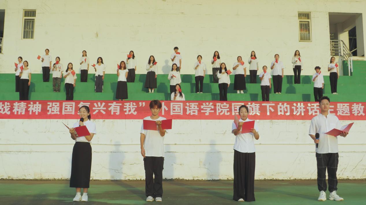 外国语学院学生代表孙好熠、王星博、瞿训雯、孙兆岩,共同朗诵《青春之火,照耀山河》。在诗歌朗诵中,莘莘学子更加坚定理想志向,赓续先辈薪火,以“四万万人齐蹈厉,同心同德一戎衣”的抗战精神积极进取、报效祖国!