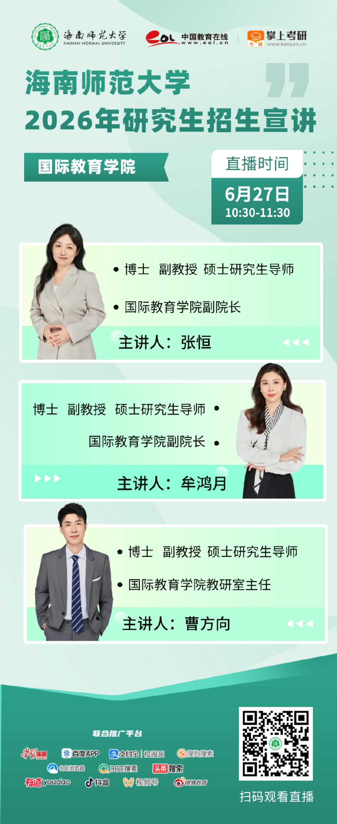亲爱的考生、家长朋友们: 6月23日起,星空游戏官方2026年研究生招生直播宣讲活动惊喜来袭!学院名师权威解读研招政策、学科专业特色及发展优势、研究生培养计划及就业情况,为2026年研考同学们全程在线答疑解惑! 让我们相约云端直播间,了解心仪专业,为你研究生梦想助力启航!相约2026,与你在海师相见! 欢迎扫码参与直播间!