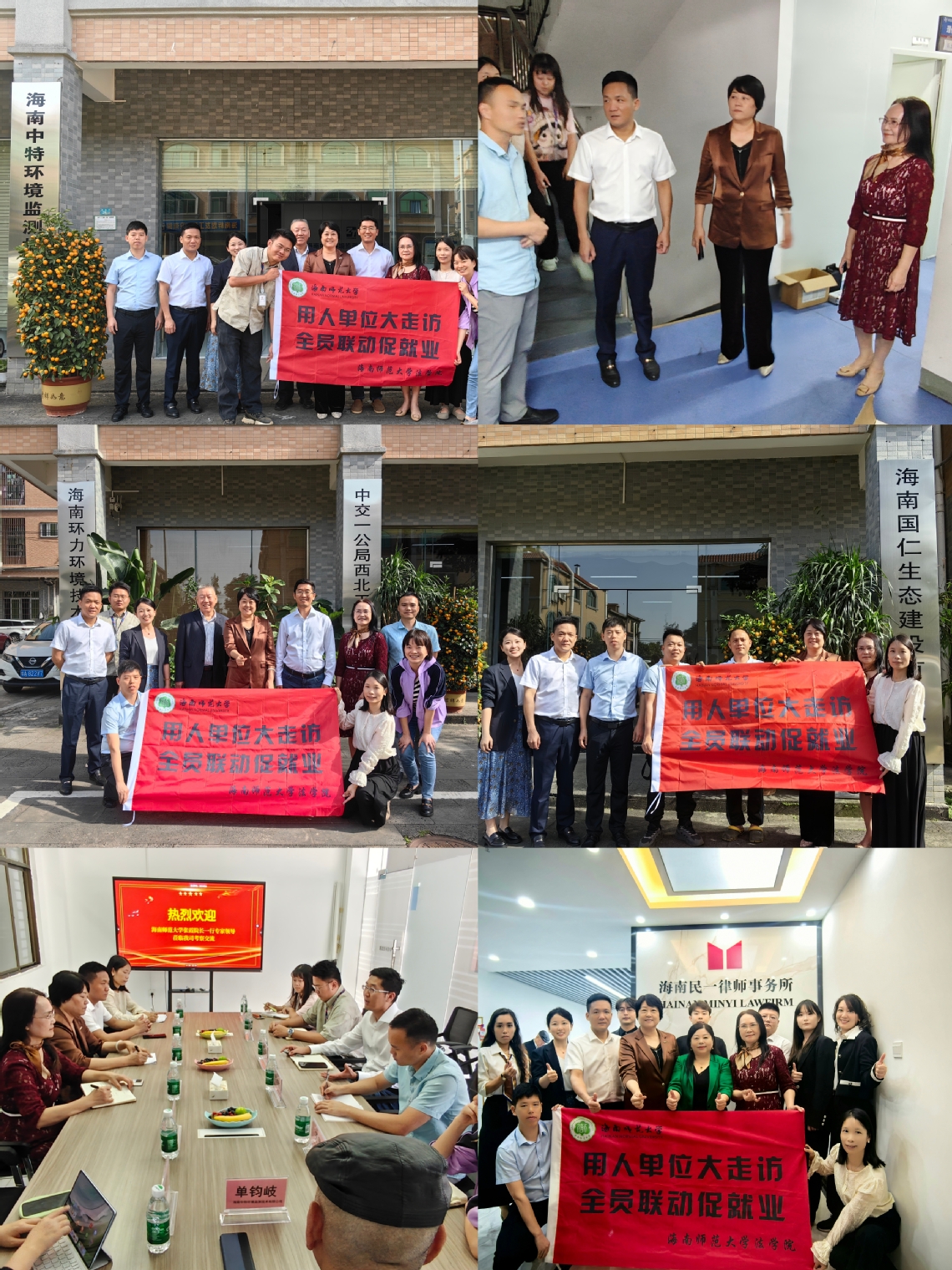 为深入推进访企拓岗促就业行动,强化供需对接,全力促进2025届毕业生高质量充分就业,2025年4月14日,法学院院长张霞、正处级辅导员李秋花、副院长周兆进、系副主任臧昊、李雪副教授、辅导员禤丽琴一行走访了海南中特环境监测技术有限公司、海南环力环境技术有限公司、海南国仁生态建设有限公司、海南民一律师事务所,开展访企拓岗促就业专项行动。