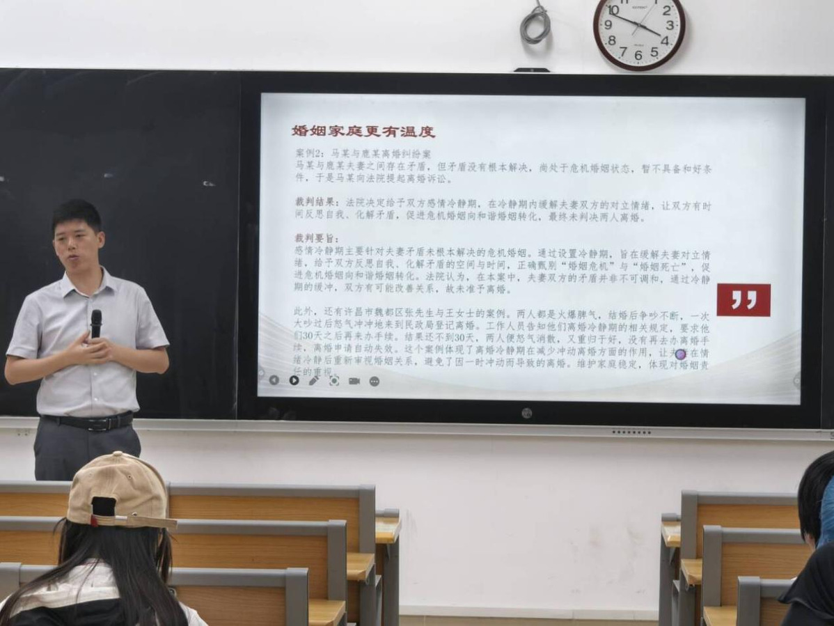 臧昊以“法治护航 知法笃行”为主题,为学生系统解读《中华人民共和国民法典》的诞生历程、体系架构及社会应用价值,通过六大典型案例剖析《中华人民共和国民法典》主要亮点。臧昊还通过互动问答形式,科普“胎儿继承权”“网购维权”“见义勇为补偿”等热点法律知识,现场反响热烈,师生纷纷表示“民法典是生活的护身符”。