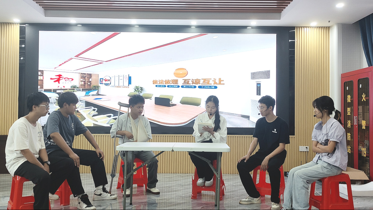 7月1日至7月17日,由唐欣瑜和朱梦飞老师带队指导的“法润民心·你我偕行”基层服务实践团先后走进府城中学、龙桥镇挺丰村、秀英街道高新社区工地等开展暑期三下乡活动。团队原创校园霸凌主题法治情景剧《不再沉默》,经一个多月的剧本设计及排练,在府城中学首演即获好评,引发现场师生热议。唐欣瑜副教授结合情景剧内容,从《宪法》、《未成年人保护法》等法律条文出发深入讲解了未成年人保护和预防犯罪与网络沉迷的相关法律知识,以专业角度剖析校园欺凌等不良行为的法律定性、责任承担及预防途径。随后,团队将“普法情景剧+法律知识讲座”的创新形式推开,拓展丰富宣讲对象,在海南自贸港数智科创园、北冲溪社区等地针对未成年犯罪预防、家庭教育促进等内容为青少年、家长等群体呈现了一堂堂“沉浸式”法治教育课。