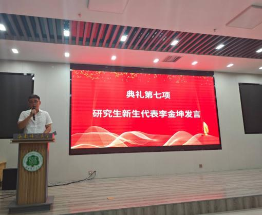 典礼第七项,2025级研究生李金坤作为研究生新生代表发言。作为一名法硕新生,李金坤倡议全体同学在思维升维、知行合一中深耕专业,恪守初心、互助共进、经世致用,用切实的行动和优秀的成绩回报学院和老师的殷切期望,成长为有担当的时代法治人才。