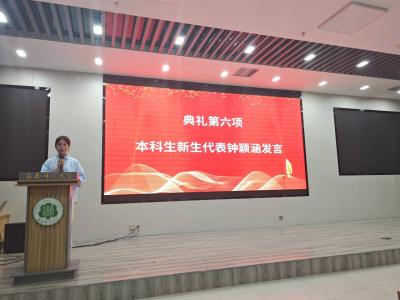典礼第六项,2025级法学1班钟颖涵同学作为本科新生代表发言,钟颖涵在感恩师长后倡议各位新生:要坚定理想、勤学善思、勇于实践、开放包容,珍惜宝贵的青春时光,奋斗成长为卓越人才,为自贸港建设和民族复兴献力。