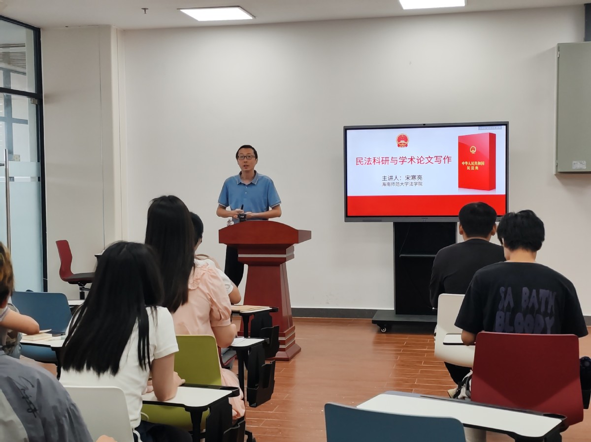 紧接着进入《民法学》课堂教学环节。宋老师结合民法学知识点,从学术积累、选题技巧、文献梳理、写作规范等多个方面,为同学们系统剖析了民法学习与民法论文写作的关系,并鼓励同学们多阅读、多交流、多思考、多写作。讲座内容翔实、逻辑清晰、语言风趣。现场同学们纷纷表示,这次教学活动的实用性强,解决了在学术入门阶段的诸多困惑,使大家对未来的科研写作充满信心。